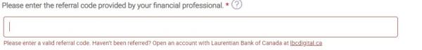 If you are having trouble locating your referral code, please contact your financial professional directly. If you have not been referred by a financial professional, you can open an account with Laurentian Bank of Canada at lbcdigital.ca