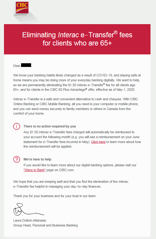 I just noticed this on my CIBC chequing account:"Jul 31, 2020 Branch Transaction E-TRANSFER NETWORK FEE $1.50"