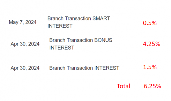 I am surprised to see the "smart interest" payment in my account today, so I have "interest", "bonus interest" and "smart interest" payments. In my case (Balance $25,000 to $99,999.99), the total interest rate is 6.25%.