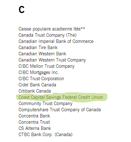 Coast Capital Savings has just announced today, via press release, that effective this Thursday, November 1st, 2018, they will officially be re-incorporated as a federal credit union under the previously announced new legal name, Coast Capital Savings Federal Credit Union. Transitional CDIC insurance kicks for the next 180 days, inclusive, on pre-existing deposits prior to the "go live" date while normal CDIC insurance limits would be applicable to deposits from new customers.