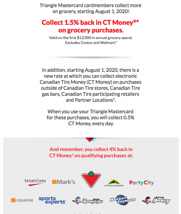 OfflineI received this via email today. Effective Aug 1, 2020, Triangle Mastercard will be adding the new rate of 1.5% back in CT money on grocery purchases, excluding Costco & Walmart. But the rate will be reduced on purchases outside of their participating retailers to 0.5% from 0.8%.