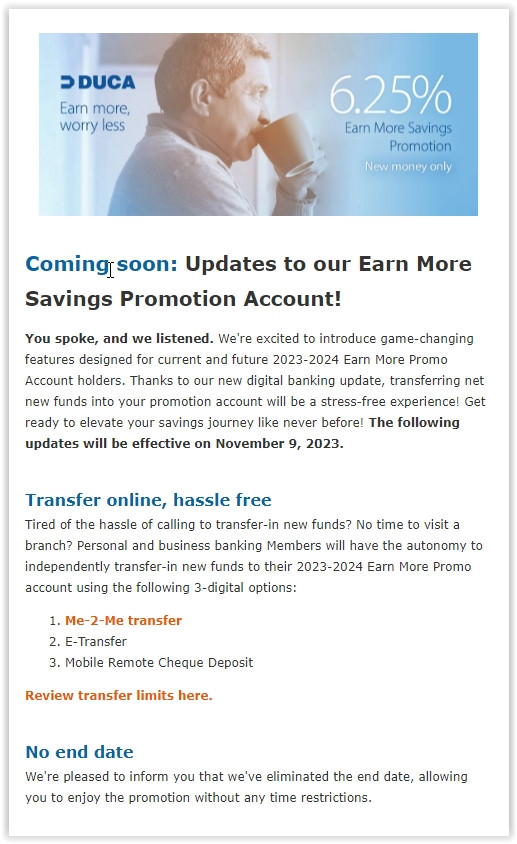 "suspect it's more like "we're not committing to a duration for 6.25% and we're giving us the option to reduce the rate at any time".Will DUCA give reasonable advance notice if they discontinue the promo?