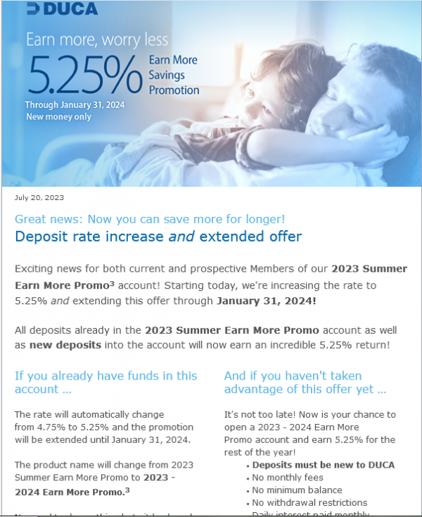 You can continue to earn high interest through the new Summer campaign by bringing in your new deposits to DUCA!