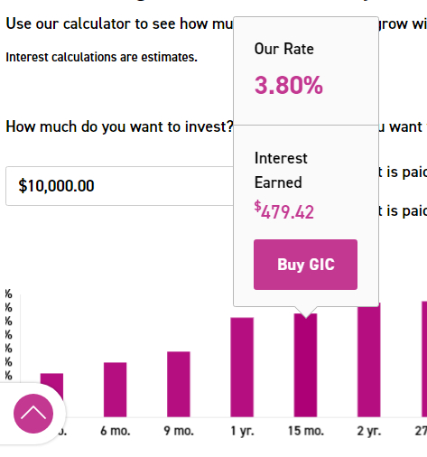 Hello,For $10k @ 3.80% for 15 months, EQ's GIC calc shows the return to be $479.42 interest earned.