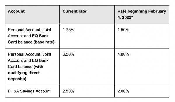 OfflineWe’re writing to inform you that on February 4, 2025, the following interest rate changes will take effect for EQ Bank accounts:
