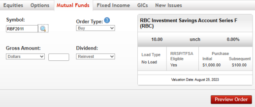 RBC DI disappoint me because I think they do not even allow their own clients trade the RBF F series. I assume if one can not even buy them in RBC DI, one can not buy anywhere else. …RBC Investment Savings Account, Series F (RBF2011) seems to available through Scotia iTRADE. The FundSERV symbol is recognized and one can proceed all the way to the confirmation of the buy order.