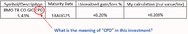 As shown in the table above the investment is listed as 'BMO TR CO GIC CPD'. I would like to know what the term 'CPD' means in this instance. That is probably a clue to why this GIC is different than the previous GICs I purchased. I like to track my investments to make sure they agree with the providers. I am not sure how to categorize this increase (or potential decrease) in the value of my GIC principal prior to maturity.