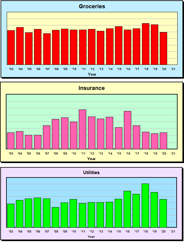 I played around with our records to see if I could detect effects of inflation. I don’t think I succeeded on the expense side. The non-discretionary categories Groceries, Insurance and Utilities that seem to be ‘more expensive’ are depicted here. Most assuredly we will have higher Grocery costs for the year. The years ’18 – ’20 we lived full time in Canada. Previous years we were away 5-6 months per year. In all categories, there are too many ‘explanations’ required to rationalize the differences.The ‘real numbers’ don’t show again. I removed the Y-axis information. It is too personal and not relevant to the purpose of showing useful year-to-year comparative variations.