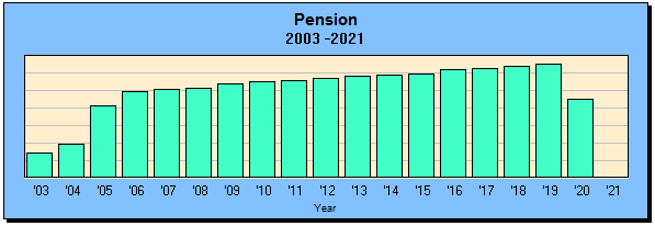 I report it for one reason only, because it’s what is used for indexation of government benefits.Vatox, you are so correct on this. It didn’t stop me from trying but I came to the same conclusion you did. Where inflation, and its inherent ‘inflation adjustment’, comes into play is on the income side. The graph below depicts our pension income much of which is indexed to inflation.
