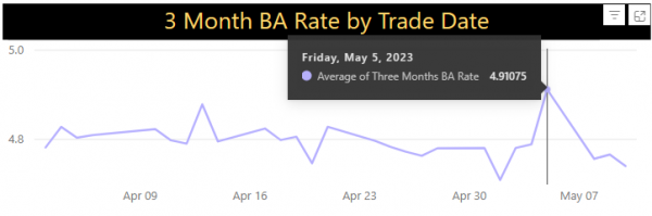 There has been some volatility in the yield of bankers' acceptances the past few weeks.Yield of three-month bankers' acceptances have been bouncing around 4.7% to 4.9%. Went up to 4.91% on Friday for a day before coming back down to around 4.75% on Monday: