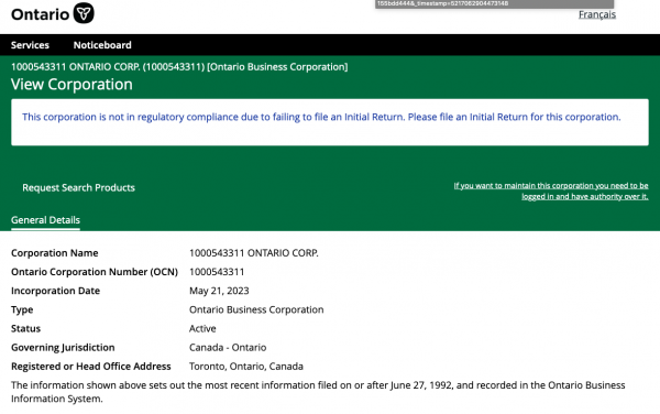 According to the Ontario Business Registry 1000543311 ONTARIO CORP in non-compliant in filing. The registered corp may have no connection to the scammers, but another Red Flag!