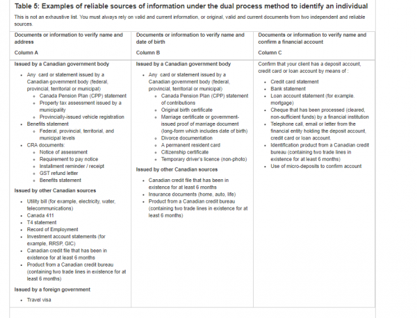From: "Methods to Identify Individuals and Confirm the Existence of Entities." Financial Transactions and Reports Analysis Centre of Canada, http://www.fintrac.gc.ca/guida.....11-eng.asp. Accessed 22 February 2018.