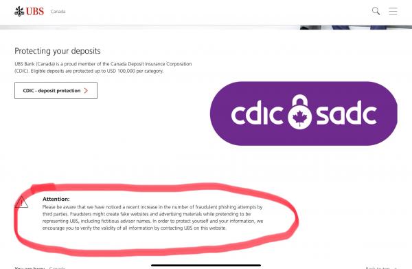 OfflineIs UBS bank aware of the fake website? I don't see any warning on its website (https://www.ubs.com/ca/en.html).