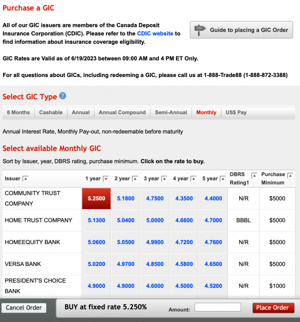 - Buy a 1-year GIC, interest payed monthy (5.50% issued by either TD MTG, TD PAC MTG & CDA TR)