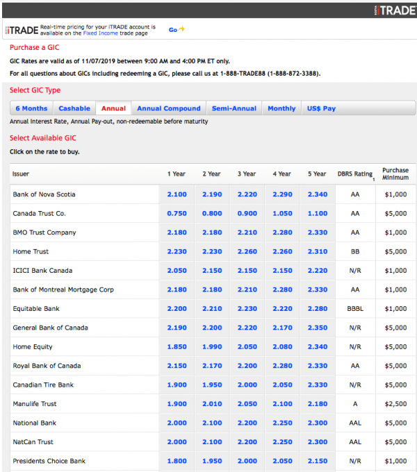 eg. 5 year GIC for BNS is 1.6% posted on their website but 2.33% through TD Direct Investing. I hope anyone approaching BNS demands at least what they pay through TD Direct Investing.