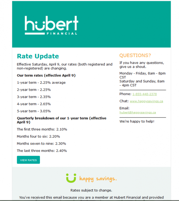 Just saw the latest email with rate update as well, it's too bad I just bought a 1 year GIC about a week ago :/ Does anyone know if Hubert would apply the new rate retroactively to a recently purchased GIC (similar to Oaken) if asked? Has anyone ever tried this?I suppose I could redeem it now and repurchase, but I would hate to lose the interest gained so far..