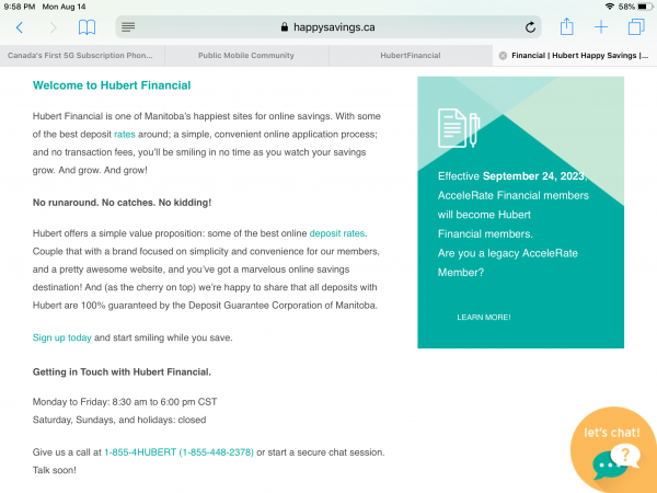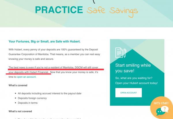 Re deposit insurance, on this page https://www.happysavings.ca/ , when I go to the bottom right, I see a link to "100% deposit guarantee," and by clicking that link, I still see the page that states "The best news is even if you’re not a resident of Manitoba, DGCM will still cover your deposits with Hubert Financial."