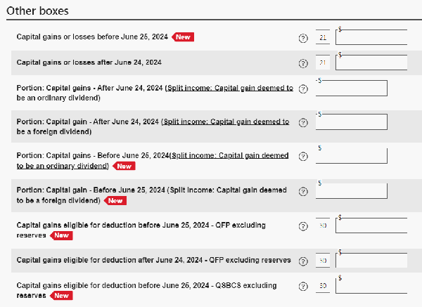 The T3s I have received have a number in Box 21 for capital gains BUT the T3 slip also has Box 52 and Box 53 numbers. The addition of Boxes 52 and 53 = Box 21. Box 52 is the amount for pre-June 25th and Box 53 is the amount for June 25th and later, so you put the Box 52 number in Box 21 in Ufile pre-June 25th and Box 53 number in Box 21 in Ufile June 25th or later.