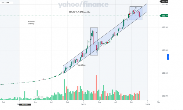 The week of the announcement there was significant trade volume but the price stayed stable in a normal range. This tells me the Market Makers gladly stepped in and absorbed the trades. So the initial announcement caused an immediate reaction but going forward trading started to resume normally and the price increased steadily as it should. It shows traders were no longer concerned by Horizons' warning. There was no volatility in the price until about Sept. , 2022 Its my opinion this is where that shortage of supply compared to demand was beginning to affect the price spread. This is the time when interest rates were increasing and predicted to increase into the future. Rectangle A is when that group of FI's in the states suddenly cracked causing a rush of sellers wanting to exit their positions after obviously a period of irrational exuberance in HSAV just prior to that mini bank crash. Now market markers are NOT stock chasers. Their 1st strategy is to catch trades that are out of the money in their favour. 2nd is to provide a price at fair market value of the underlying assets. They have no obligation to ensure an offer (in general), especially when they cannot determine what is fair market value for a given product. This only happens under extreme market conditions. In this case , HSAV is money in the bank , literally. From the trend pipe you can see that there is price stability along the bottom trend line. This tells me that the market markers are stepping in when there is a fair market value price in play. Now this takes us to current times. HSAV price action was getting ahead of itself again. This is when bonds were on a tear. You can see the peak of HSAV in the beginning of October. At this point, the Economic data was softening and interest policy placed on hold by central banks calling for a prediction by the market for the leveling off of interest rates , at least in the near future that is. Bonds nose dived . I think this is what is being reflected in the rolling over pattern in box B of the HSAV chart.