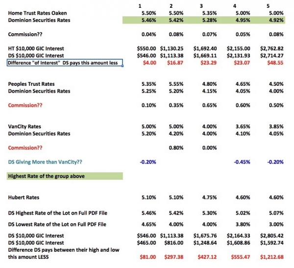 You can see that it appears there is an inconsistent commission %. I always under stood that commission on a GIC was .25%. I have also included the differences of interest accrued and difference.So times are good rate wise. Now thinking back, I don’t think I was impressed with the brokers or iTrade when a 5 year rate was 2%. Today it looks good. When rates go down.....the commissions remain no matter what? And the % will look better by dealing direct?