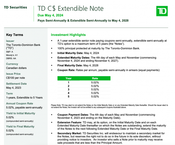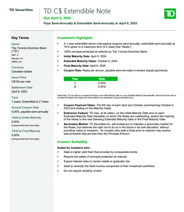 New Issues on TDDI: TD Bank C$ Extendible Notes 5.38%, payable semi-annually.Term: 1-year, Extendible to 2 years