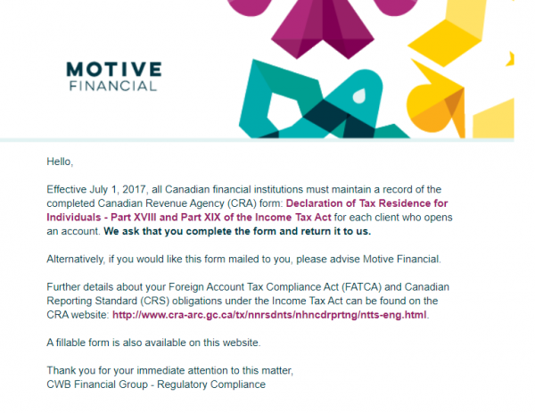 I also received one yesterday by email. I may call them as I have two accounts and am wondering if I should write both account numbers on the declaration. I do not really like sending my SIN over the internet - what do you all think?Considering that this has been required since July 2017, they can't be too fussy about how quickly we reply, right??