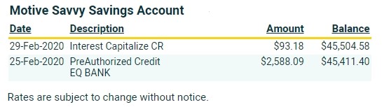 From Motive site: "Interest is calculated on the daily closing balance at the applicable rate tier and paid on the last day of the month, for the period beginning on the last day of the previous month and ending on the second last day of the month."