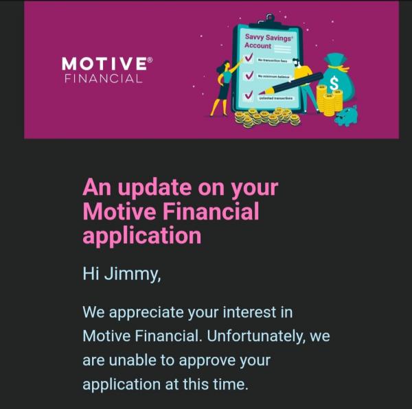 I did call, just got the voice-mail, leave message scenario. I read through the other posts at Motive on people whose application was rejected. All the criteria listed are met- credit rating, Equifax, Transunion etc. I do get the Tangerine and Simplii promotions frequently so not really a loss, but wanted to keep within CDIC limits.