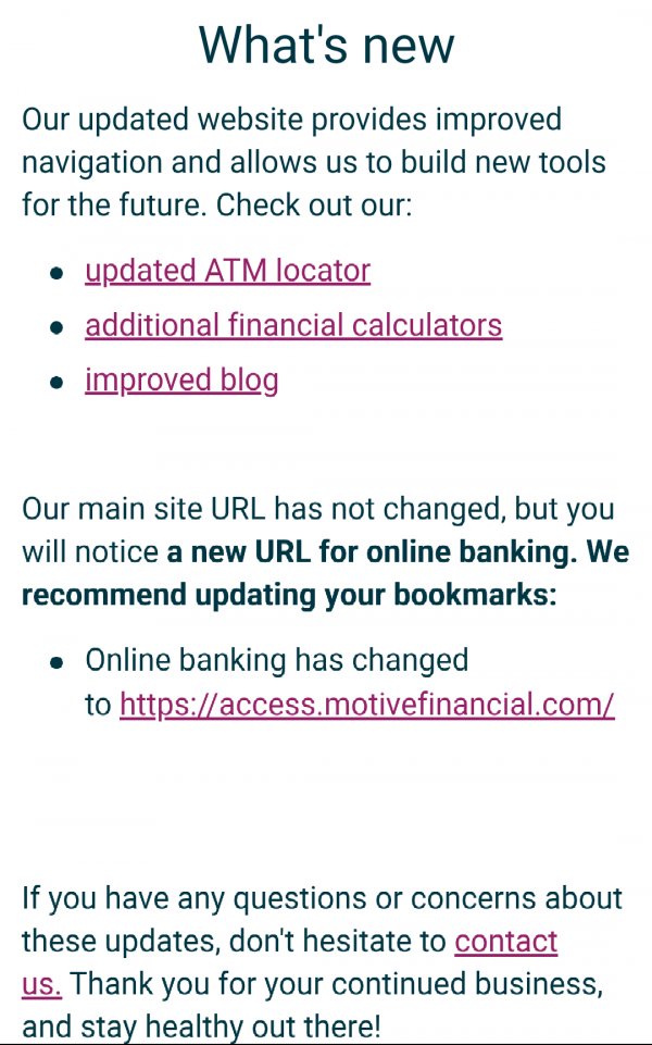 Android Motive bank app stopped working today: crashes on starts. Must be related to new Web site launch.