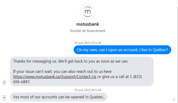 OfflineHi, back in April 2019, I tweeted Motusbank and asked them if they serviced Quebec, and for which products. They answered that they did and only deposit products (chequing, savings and investments) were available.