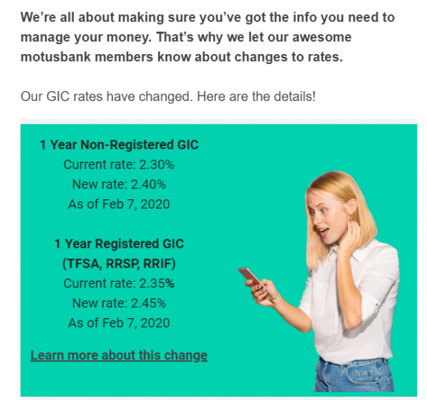 We’re all about making sure you’ve got the info you need to manage your money. That’s why we let our awesome motusbank members know when rates have changed.