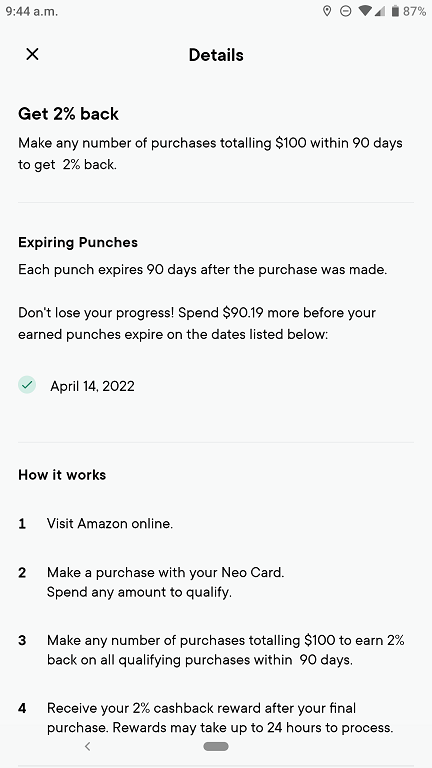 Screenshot from Neo app on my smartphone, after spending first $9.81 at Amazon under new rules: