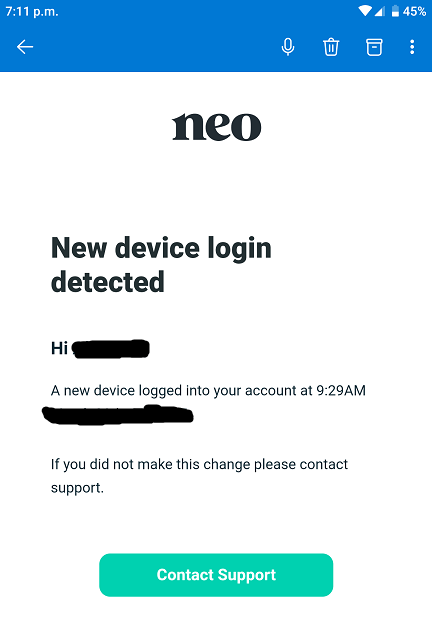 Also, once I installed Neo app on my new smartphone, I was alerted by email about that.