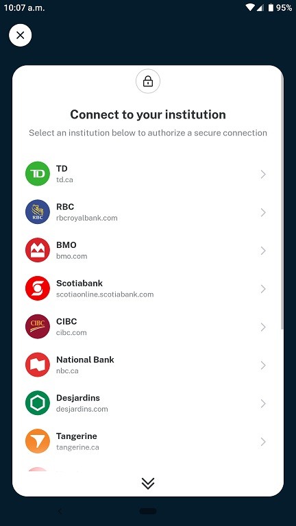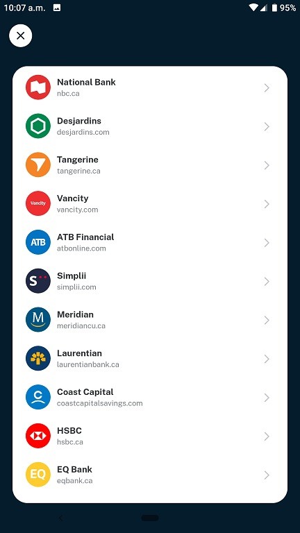 Many familiar bank names present, but if your bank is not on that list you are out of luck: you can't enter Transit/Bank/Account numbers manually, you must choose bank from the list.