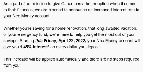 Neo Financial Savings 1.45% (was 1.30%) | Neo Financial | Discussion forum This forum requires Javascript to be enabled for posting content Please consider registeringguest Log In Register Login name Password Remember me Register | Lost password? Select Forum Announcements New members welcome and introductions Site suggestions Credit card reward programs General comparisons General financial discussion GIC discussions Income tax filing Investing Mortgages RRSPs and RRIFs Small business accounts Tax Free Savings Accounts Your stories Achieva Financial Alterna Bank BMO Bridgewater Bank Canadian Tire CIBC Coast Capital Savings DUCA Credit Union EQ Bank Hubert Financial ICICI Bank Ideal Savings Laurentian Bank LBC Digital Luminus Financial Manulife Bank MAXA Financial MCAN Financial Meridian Credit Union Motive Financial motusbank National Bank Neo Financial Oaken Financial Omnia Direct Outlook Financial PC Financial Peoples Trust RBC Royal Bank Saven Financial Scotiabank Simplii Financial Steinbach Credit Union Tangerine Bank Vancity Wealth One Bank of Canada Wealthsimple AcceleRate Financial Ally B2B Bank Citizens Bank HSBC Implicity Financial Wyth Financial (formerly Concentra Bank) Zag Bank Zenbanx Search Advanced Search Advanced Search— Forum Scope —Current forumAll forums— Match —Match any wordMatch all wordsMatch phrase— Forum Options —Posts onlyTopic titles onlyPosts and topic titlesMinimum search word length is 3 characters - maximum search word length is 84 characters Search Home Discussion forum Neo Financial Neo Financial Savings 1.45% (was 1.30%) Topic RSS Neo Financial Savings 1.45% (was 1.30%) Facebook Twitter Email this April 20, 20221:51 pm Alexandre Member Members Forum Posts: 1354 Member Since: November 8, 2018 Offline 1 All RSS © Simple:Press New/Recently Updated Topics Tangerine CC Mastercard Costco Gas? Finding the best GIC Rates TD Easy Trade 2025 Spring Offer (EASYSTA… TFSA with EQ? Amazon.ca knows too much about us???? 24/5 Round-The-Clock U.S. Stock Trading … Vanilla Prepaid Visa Card (product of Pe… Windows 11 Pros & Cons Laurentian LBC and B2B become the latest… External Transfers with Meridian New Promo Savings Accounts 4.70% (385% +… Motive Financial accounts migrating to N… Whaaat? Just this and no chocolates this… GIC stuck in processing Oaken App Issue & Voice Authenticati… Problems & Issues Linking External A… Limited Time Offer!! Open 1st Simplii TFSA to earn 3.90% for … Grow your savings with an amazing 2.75%*… Tangerine GIC rates