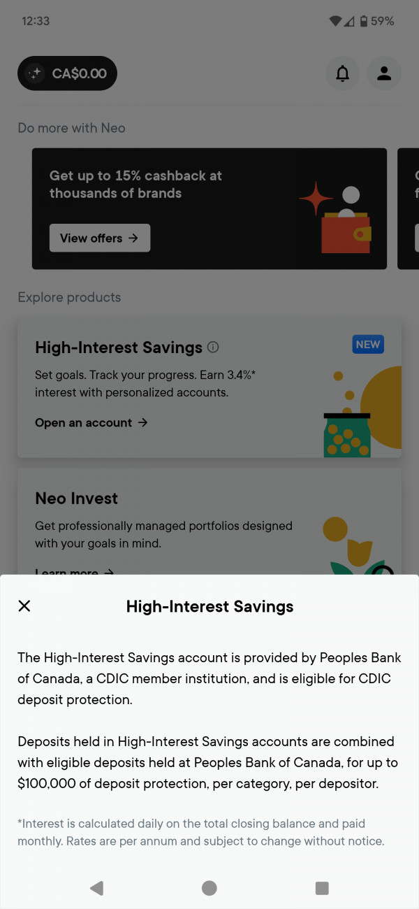 Interesting, thanks! I couldn't find it when logged in via a browser.Neo Money deposits are held by Concentra Bank (now owned by EQ Bank), whereas this new savings account is offered by Peoples Bank. 3.40% is also what Peoples offers directly. Perhaps EQ Bank refused to offer a higher rate, so Neo started looking elsewhere.