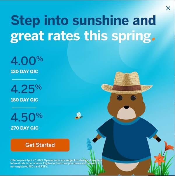 "To mark the start of spring, we are offering special short-term GIC rates of 4.00% for 120 day, 4.25% for 180 day and 4.50% for 270 day if you open a new account between April 13 and April 27, 2023.