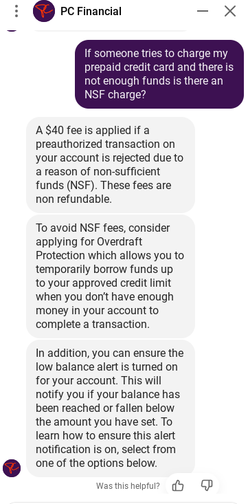 PCFinancial is taking advantage of the poorest demographic which needs a pre paid card but then gives only an option of an insane interest charge or an insane NSF fee.