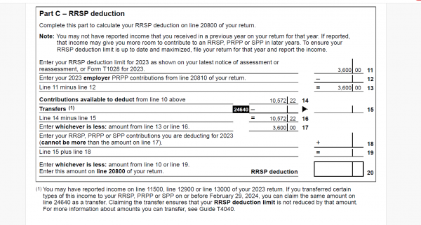 (1) You may have reported income on line 11500, line 12900 or line 13000 of your 2023 return. If you transferred certain types of this income to your RRSP, PRPP or SPP on or before February 29, 2024, you can claim the same amount on line 24640 as a transfer. Claiming the transfer ensures that your RRSP deduction limit is not reduced by that amount. ….