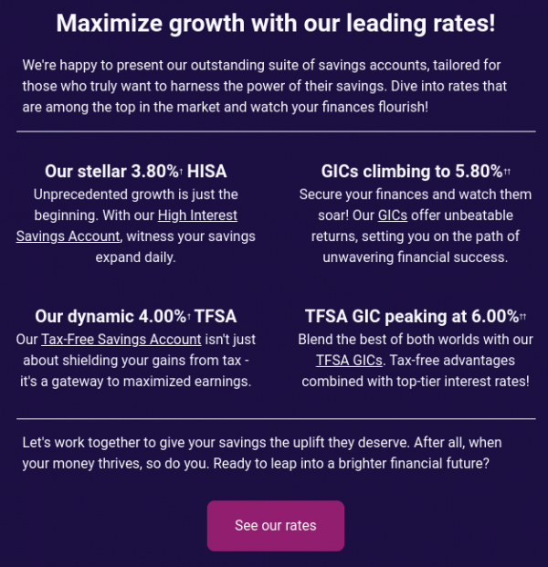 SAVEN is heading to the top | Saven Financial | Discussion forum This forum requires Javascript to be enabled for posting content Please consider registeringguest Log In Register Login name Password Remember me Register | Lost password? Select Forum Announcements New members welcome and introductions Site suggestions Credit card reward programs General comparisons General financial discussion GIC discussions Income tax filing Investing Mortgages RRSPs and RRIFs Small business accounts Tax Free Savings Accounts Your stories Achieva Financial Alterna Bank BMO Bridgewater Bank Canadian Tire CIBC Coast Capital Savings DUCA Credit Union EQ Bank Hubert Financial ICICI Bank Ideal Savings Laurentian Bank LBC Digital Luminus Financial Manulife Bank MAXA Financial MCAN Financial Meridian Credit Union Motive Financial motusbank National Bank Neo Financial Oaken Financial Omnia Direct Outlook Financial PC Financial Peoples Trust RBC Royal Bank Saven Financial Scotiabank Simplii Financial Steinbach Credit Union Tangerine Bank Vancity Wealth One Bank of Canada Wealthsimple AcceleRate Financial Ally B2B Bank Citizens Bank HSBC Implicity Financial Wyth Financial (formerly Concentra Bank) Zag Bank Zenbanx Search Advanced Search Advanced Search— Forum Scope —Current forumAll forums— Match —Match any wordMatch all wordsMatch phrase— Forum Options —Posts onlyTopic titles onlyPosts and topic titlesMinimum search word length is 3 characters - maximum search word length is 84 characters Search Home Discussion forum Saven Financial SAVEN is heading to the top Topic RSS SAVEN is heading to the top Facebook Twitter Email this October 27, 20231:46 pm KamWest Toronto Member Members Forum Posts: 511 Member Since: December 20, 2019 Offline 1 https://savenfinancial.ca/en/on-rates?utm_source=delivra&utm_medium=email&utm_campaign=Saven%20October%202023%20Monthly%20Email&utm_id=6008503&utm_term=Rates+%7C+Saven+Financial&dlv-emuid=3ef4943f-b2c7-4a61-83f4-715f73362885&dlv-mlid=6008503 Got this email today... Some of those rates look pretty darn good. I have an old Saven account, I may move in the TFSA, at 6% you can't go wrong. All RSS © Simple:Press New/Recently Updated Topics Tangerine CC Mastercard Costco Gas? Finding the best GIC Rates TD Easy Trade 2025 Spring Offer (EASYSTA… TFSA with EQ? Amazon.ca knows too much about us???? 24/5 Round-The-Clock U.S. Stock Trading … Vanilla Prepaid Visa Card (product of Pe… Windows 11 Pros & Cons Laurentian LBC and B2B become the latest… External Transfers with Meridian New Promo Savings Accounts 4.70% (385% +… Motive Financial accounts migrating to N… Whaaat? Just this and no chocolates this… GIC stuck in processing Oaken App Issue & Voice Authenticati… Problems & Issues Linking External A… Limited Time Offer!! Open 1st Simplii TFSA to earn 3.90% for … Grow your savings with an amazing 2.75%*… Tangerine GIC rates