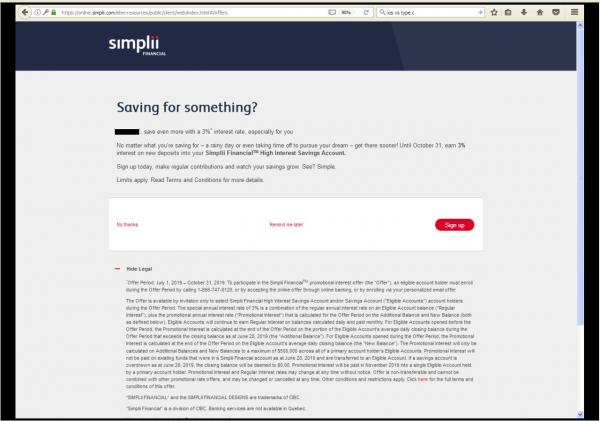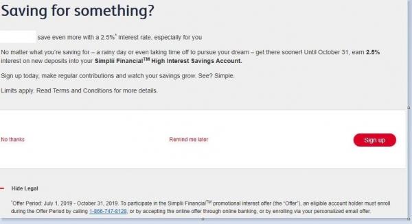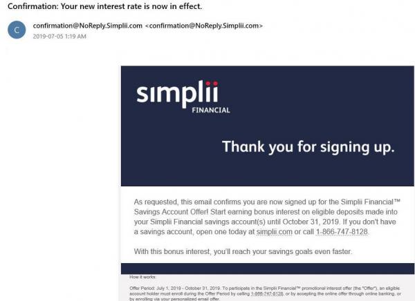 OfflineSomething is weird with Simplii. They offered 2.5% bonus interest on new deposits from July 1-Oct.31/19 which I accepted online but never got an email confirmation. I called and it hadn't gone through so they signed me up but I still didn't get a confirmation. I called to request an email confirmation which they sent but it never arrived. I called again and gave them a different email account and they sent the confirmation again. They said it would take up to TWO HOURS to arrive in my IN box. Well, it's been over two hours and still no confirmation. I'd love to hear from anyone who has had success getting a confirmation of this latest offer.