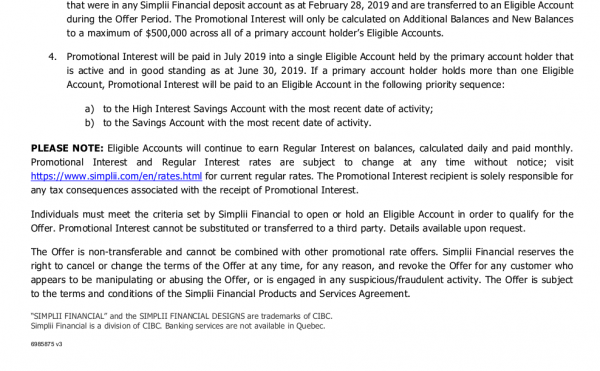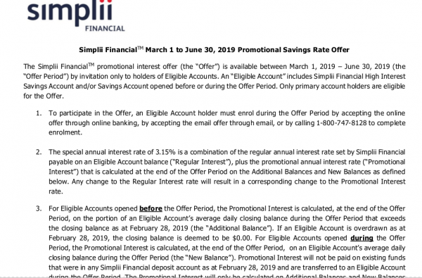 *Offer Period: March 1, 2019 – June 30, 2019. To participate in the Simplii Financial™ promotional interest offer (the “Offer”), an eligible account holder must enroll during the Offer Period by accepting the online offer through online banking, by accepting the email offer through email, or by calling 1-888-723-8881. The Offer is available by invitation only to holders of Simplii Financial High Interest Savings Account and/or Savings Account (“Eligible Accounts”).