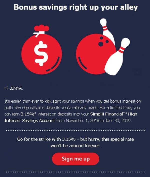 For a limited time, you can earn 3.15%* interest on deposits into your Simplii Financial™ High Interest Savings Account from November 1, 2018 to June 30, 2019. That means you’ll earn interest on deposits you’ve already made – plus on new deposits!