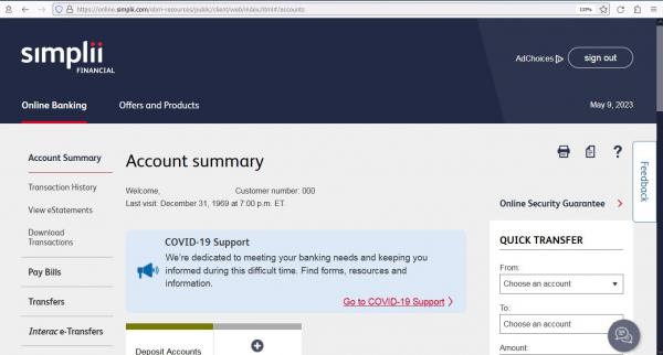 OfflineCould be just you, Winnie. My last visit date is fine. The greeting is first name basis on mine. I see none on yours. Customer number 000 means it is not connecting to any record in the database. Also the $0 balance. Is there actually an active account with a balance? Rogue card with a password? Is there a newer card? If there still business with Simplii, you should call in for a fix.