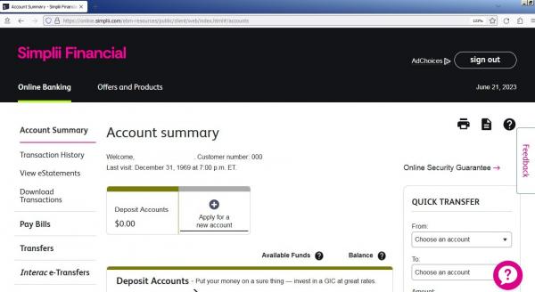 OfflineMy name (first and last) was there, I just erased them before posting here. And customer number was correct also. I just erased last 7 digits 000xxxxxxx. Yes, $0 balance and active account - at least 2 transactions each month and every month all the time. And yes, I usually login every week or every 2 weeks. I also have Simplii active debit card (Master Card debit), but not using it regularly. When Simplii will offer to me at least 5.25% HISA, I probably will do more business with Simplii. For now I'm happy with my $0 balance.