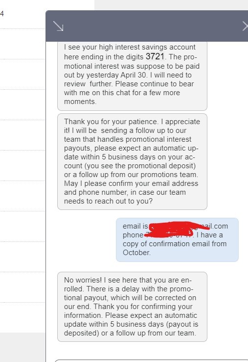 OfflineI saw several people posting they had received their promo interest from Simplii around April 12/14. When mine wasn't there by the 20th, I contacted them and was told the promo could be paid anytime up to April 30. On May 1 it still wasn't there and I contacted them again. Now they are "investigating". I mentioned still having my confirmation email but he said they could see I was enrolled. I have attached my screen shot of the chat but as of May 3, I still have not been credited.
