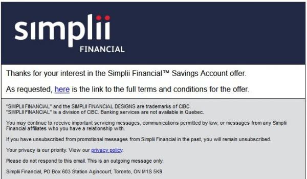 All I received was "Thanks for your interest in the Simplii Financial Savings Account offer. As requested here is the link to the full terms and conditions for the offer"