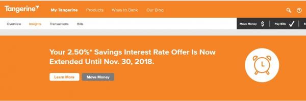 New deposits to your Tangerine Savings Account(s), Tax-Free Savings Account(s) and RSP Savings Account(s) will earn 2.50% until November 30, 2018.