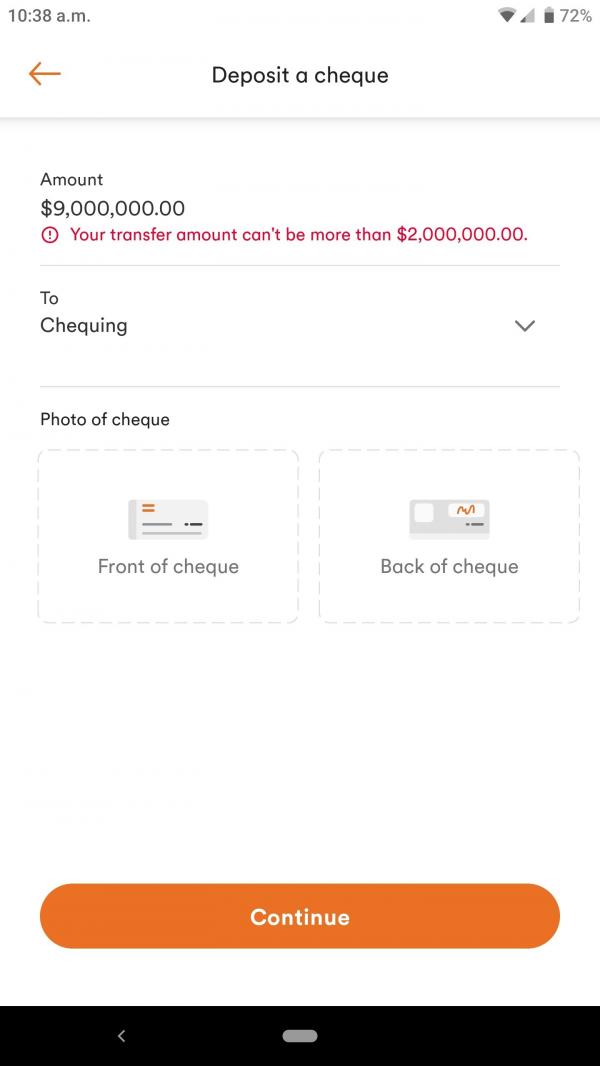 On the other hand, depositing funds to Tangerine using the BNS ATM's is limited to $99,999 per transaction. Also, BNS ATM's are not the most user friendly.