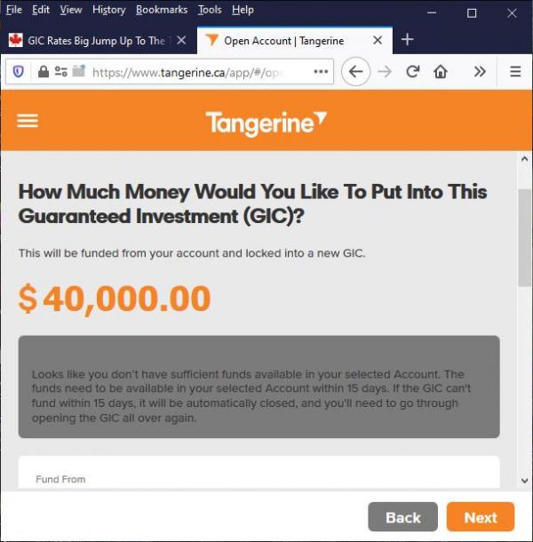 I need this rate to stay till April 10th. I have GICs maturing with Oaken on April 20. Hopefully Tangerine keep the offer for 2 weeks. We shall see!Just proceed with online application & carry on as if you have enough funds in your Tangerine accounts (I am not sure about the linked accounts). You should be able to complete the application with some sort of reference number. Rates are locked in with 15 days to provide funding to your sourcing account.